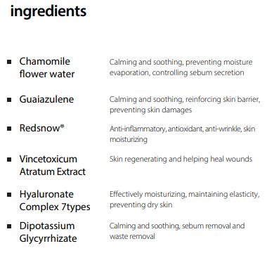 Azulene Soother Cleansing Milk contains 55% chamomile flower water, camellia flower extract, and Vincetoxicum Atratum Extract, as well as other natural ingredients to cleanse impurities in pores without irritation. It provides a moisture barrier to the skin without feeling tight even after washing, moisturizing the skin and protecting it from external irritants, creating a healthy skin condition.